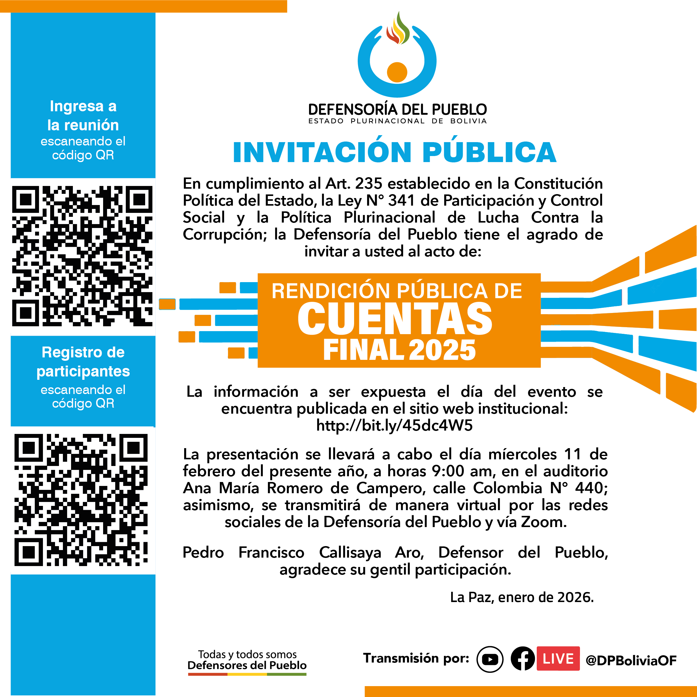 La Paz, 2 de febrero de 2026 (UCOM/DPB).- En el inicio de la Gestión escolar 2026, el Defensor del Pueblo, Pedro Callisaya, advirtió deterioro en las infraestructuras educativas y la vulneración de derechos fundamentales de estudiantes en diversas regiones del país. En su programa virtual ‘El Defensor con el Pueblo’, la autoridad difundió los resultados de las verificaciones in situ realizado por las 21 oficinas defensoriales.