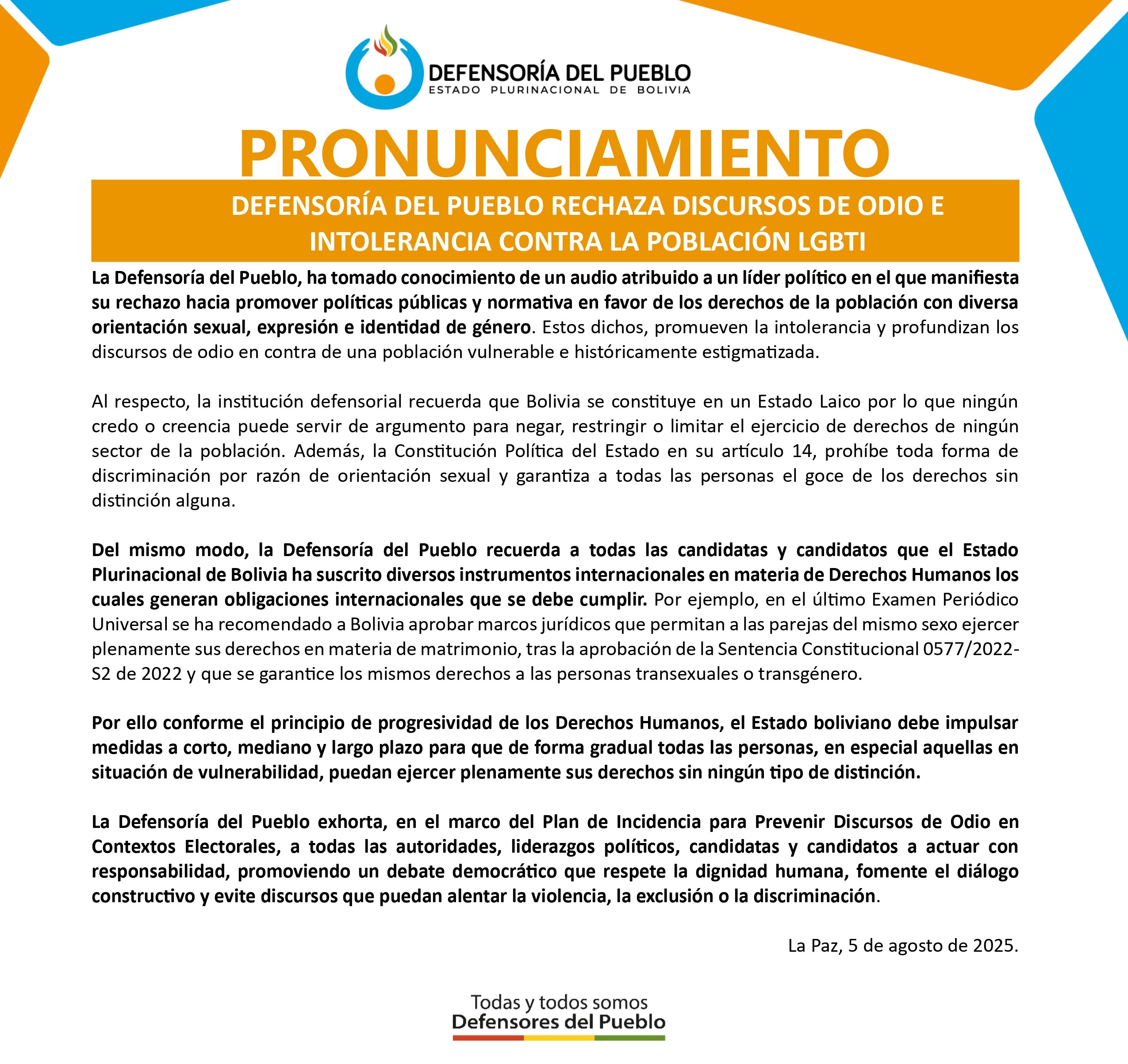 través de un Pronunciamiento, la Defensoría del Pueblo, informó que tomó conocimiento de un audio atribuido a un líder político en el que manifiesta su rechazo hacia promover políticas públicas y normativa en favor de los derechos de la población con diversa orientación sexual, expresión e identidad de género. “Estos dichos, promueven la intolerancia y profundizan los discursos de odio en contra de una población vulnerable e históricamente estigmatizada”. Ante esto, el Pronunciamiento defensorial recuerda que “Bolivia se constituye en un Estado Laico por lo que ningún credo o creencia puede servir de argumento para negar, restringir o limitar el ejercicio de derechos de ningún sector de la población. Además, la Constitución Política del Estado en su artículo 14, prohíbe toda forma de discriminación por razón de orientación sexual y garantiza a todas las personas el goce de los derechos sin distinción alguna”. “La Defensoría del Pueblo recuerda a todas las candidatas y candidatos que el Estado Plurinacional de Bolivia ha suscrito diversos instrumentos internacionales en materia de Derechos Humanos los cuales generan obligaciones internacionales que se debe cumplir. Por ejemplo, en el último Examen Periódico Universal se ha recomendado a Bolivia aprobar marcos jurídicos que permitan a las parejas del mismo sexo ejercer plenamente sus derechos en materia de matrimonio, tras la aprobación de la Sentencia Constitucional 0577/2022-S2 de 2022 y que se garantice los mismos derechos a las personas transexuales o transgénero”, señala el Pronunciamiento. Ante estos hechos, la Defensoría del Pueblo exhorta, en el marco del Plan de Incidencia para Prevenir Discursos de Odio en Contextos Electorales, a todas las autoridades, liderazgos políticos, candidatas y candidatos a actuar con responsabilidad, promoviendo un debate democrático que respete la dignidad humana, fomente el diálogo constructivo y evite discursos que puedan alentar la violencia, la exclusión o la discriminación.