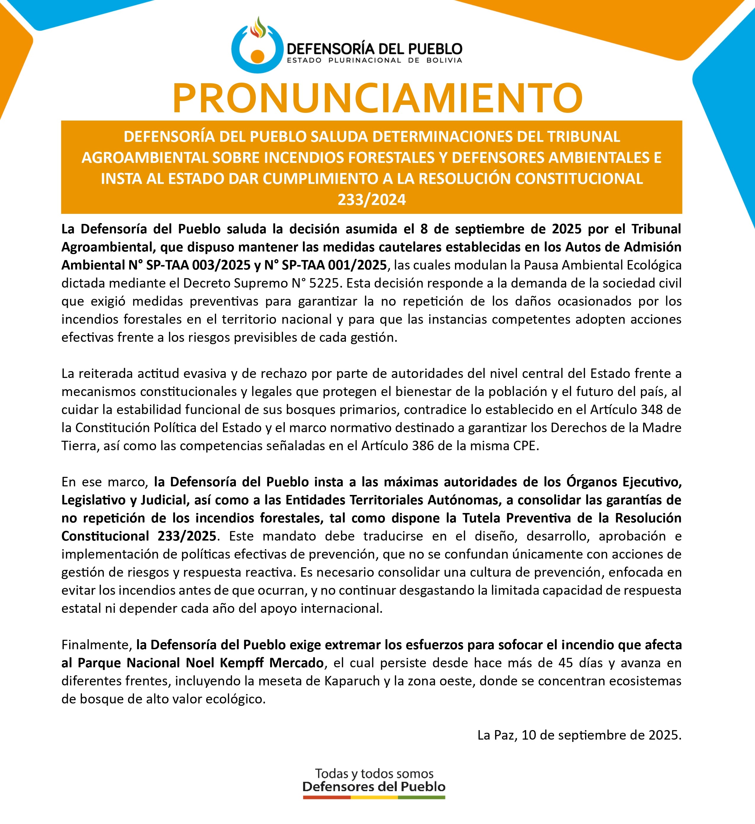 través de un Pronunciamiento, la Defensoría del Pueblo saludó la decisión asumida el 8 de septiembre de 2025 por el Tribunal Agroambiental, la cual dispuso mantener las medidas cautelares establecidas en los Autos de Admisión Ambiental N° SP-TAA 003/2025 y N° SP-TAA 001/2025. En ese marco, la institución defensorial instó a las máximas autoridades de los Órganos Ejecutivo, Legislativo y Judicial, así como a las Entidades Territoriales Autónomas, a consolidar las garantías de no repetición de los incendios forestales, tal como dispone la Tutela Preventiva de la Resolución Constitucional 233/2025. “Este mandato debe traducirse en el diseño, desarrollo, aprobación e implementación de políticas efectivas de prevención, que no se confundan únicamente con acciones de gestión de riesgos y respuesta reactiva. Es necesario consolidar una cultura de prevención, enfocada en evitar los incendios antes de que ocurran, y no continuar desgastando la limitada capacidad de respuesta estatal ni depender cada año del apoyo internacional”, señala el Pronunciamiento. La decisión del Tribunal Agroambiental, modulan la Pausa Ambiental Ecológica dictada mediante el Decreto Supremo N° 5225. Esta decisión responde a la demanda de la sociedad civil que exigió medidas preventivas para garantizar la no repetición de los daños ocasionados por los incendios forestales en el territorio nacional y para que las instancias competentes adopten acciones efectivas frente a los riesgos previsibles de cada gestión. Finalmente, la Defensoría del Pueblo exigió extremar esfuerzos para sofocar el incendio que afecta al Parque Nacional Noel Kempff Mercado, el cual persiste desde hace más de 45 días y avanza en diferentes frentes, incluyendo la meseta de Kaparuch y la zona oeste, donde se concentran ecosistemas de bosque de alto valor ecológico.