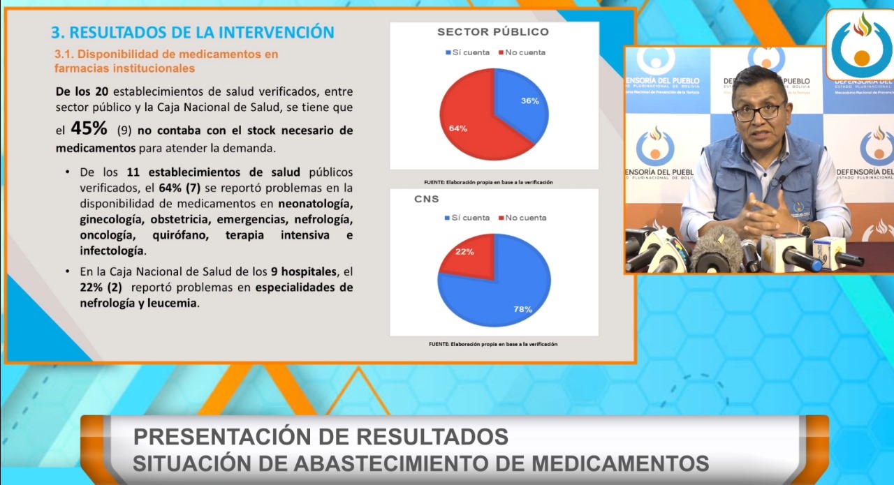 esde junio de la gestión 2023 diferentes sectores como la industria farmacéutica boliviana, empezaron a manifestarse por la escasez del dólar y una posible elevación de costos de los medicamentos; para el 2024, se dio un desabastecimiento de determinados medicamentos, situación que se fue acrecentando en lo que va del 2025. Ante esta situación, que vulnera el derecho de acceso a la salud de la ciudadanía y en especial de poblaciones en situación de vulnerabilidad, la Defensoría del Pueblo ha realizado un seguimiento al comportamiento del alza de precios medicamentos, considerando las afectaciones directas a la población, ante la falta de un normal abastecimiento de medicamentos y dispositivos médicos en el país. Como parte de este trabajo, y el marco de las competencias institucionales, se realizaron una serie de actividades con el objetivo de incidir ante instancias estatales para que se garantice la provisión de medicamentos en el Sistema Nacional de Salud, con énfasis en medicamentos para pacientes oncológicos y renales, puesto que el desabastecimiento y el alza de precios afecta de manera directa a la población en general y a grupos en situación de vulnerabilidad como pacientes con enfermedades crónicas, en particular. Entre las distintas acciones defensoriales, se sostuvieron reuniones con los actores involucrados en la temática como la Central de Abastecimiento y Suministros de Salud (CEASS); se realizaron reuniones con la Cámara de la Industria Farmacéutica Boliviana (CIFABOL), instancia que precisa 45 millones de dólares de manera trimestral para la adquisición de medicamentos e insumos. También se abrieron espacios con la Dirección General del Seguro Universal de Salud, para tratar el tema de la transferencia de presupuesto a las Gobiernos Autónomos Departamentales y estos a su vez a los Hospitales de tercer nivel para la compra de medicamentos.