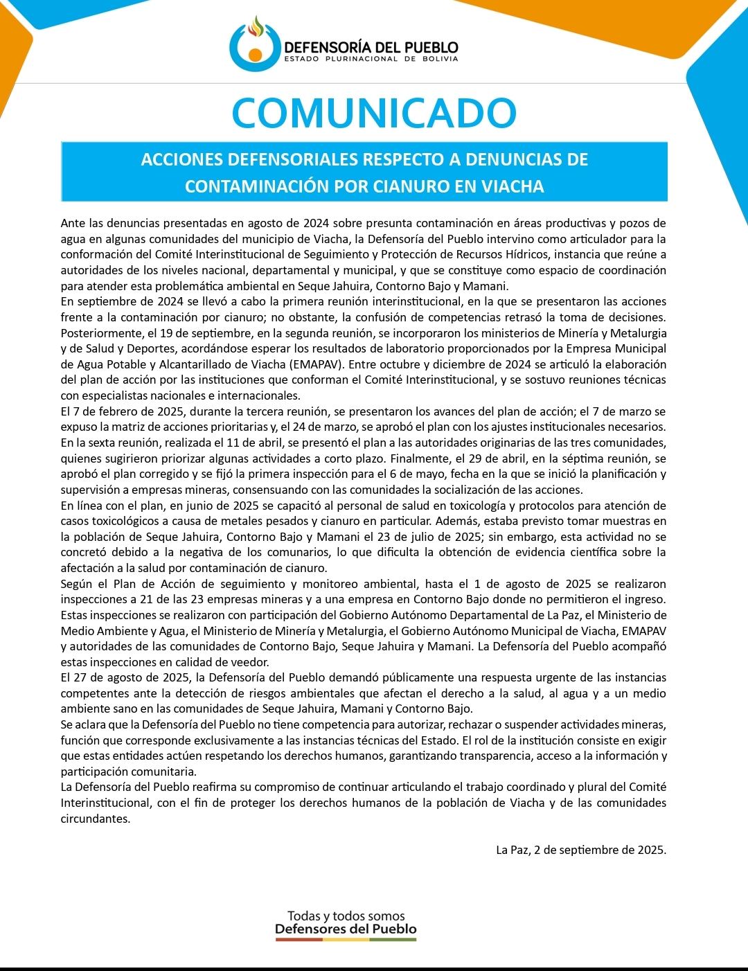 Ante las denuncias presentadas en agosto de 2024 sobre presunta contaminación en áreas productivas y pozos de agua en algunas comunidades del municipio de Viacha, la Defensoría del Pueblo intervino como articulador para la conformación del Comité Interinstitucional de Seguimiento y Protección de Recursos Hídricos, instancia que reúne a autoridades de los niveles nacional, departamental y municipal, y que se constituye como espacio de coordinación para atender esta problemática ambiental en Seque Jahuira, Contorno Bajo y Mamani.