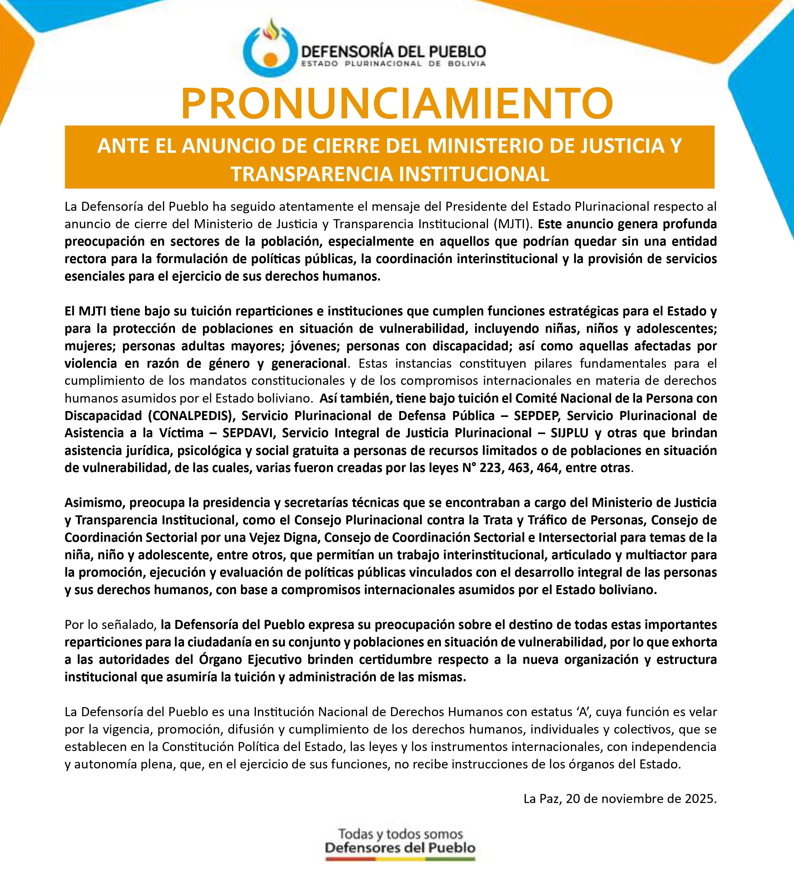 La Defensoría del Pueblo ha seguido atentamente el mensaje del Presidente del Estado Plurinacional respecto al anuncio de cierre del Ministerio de Justicia y Transparencia Institucional (MJTI). Este anuncio genera profunda preocupación en sectores de la población, especialmente en aquellos que podrían quedar sin una entidad rectora para la formulación de políticas públicas, la coordinación interinstitucional y la provisión de servicios esenciales para el ejercicio de sus derechos humanos.