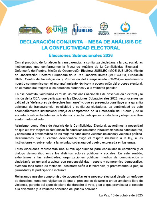 DECLARACIÓN CONJUNTA – MESA DE ANÁLISIS DE LA CONFLICTIVIDAD ELECTORAL Elecciones Subnacionales 2026