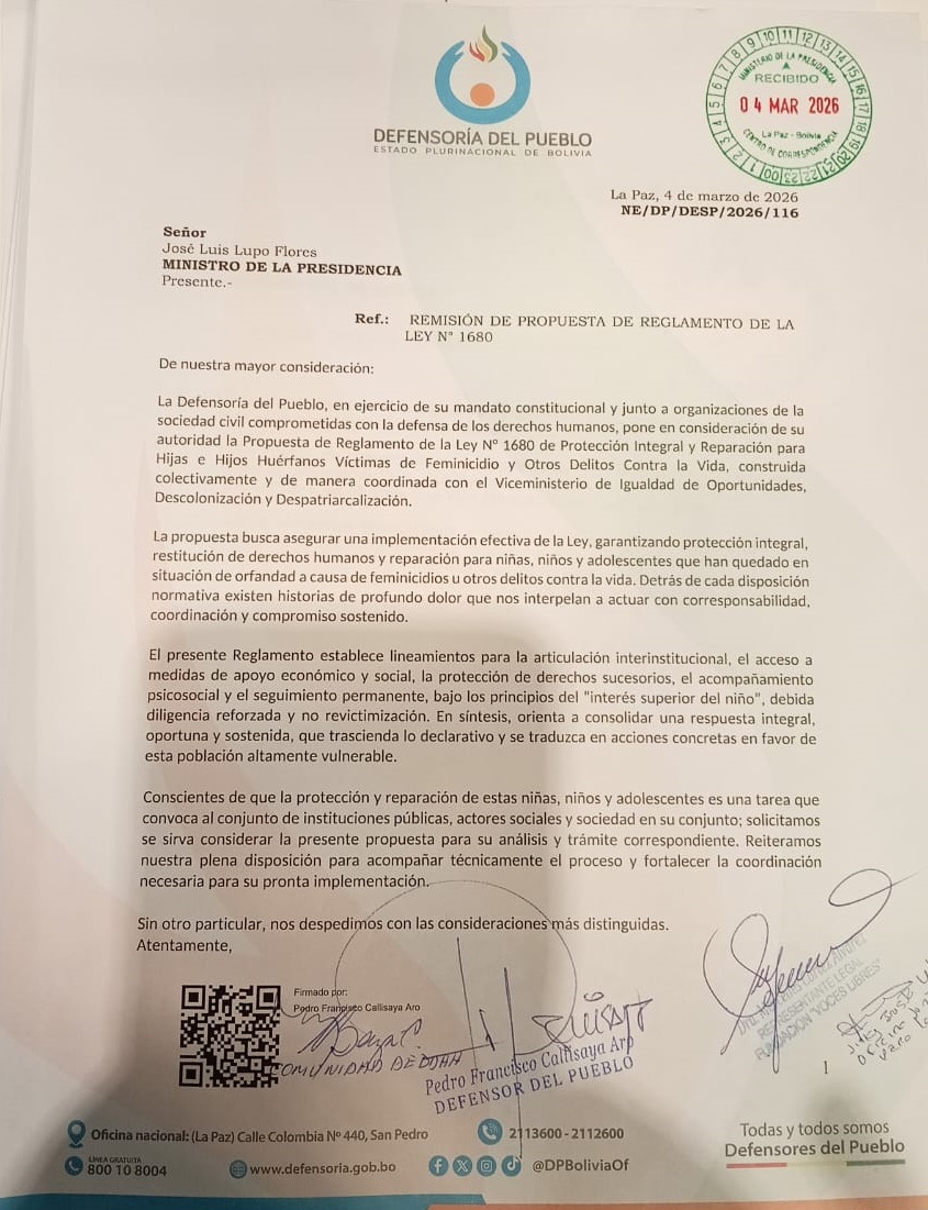 La Paz, 4 de marzo de 2026 (UCOM-DPB).– El Defensor del Pueblo, Pedro Callisaya, junto a organizaciones de la sociedad civil, realizó la entrega oficial de la propuesta de Reglamento de la Ley N° 1680, “Ley de Protección Integral y Reparación para Hijas e Hijos Huérfanos Víctimas de Feminicidio y Otros Delitos contra la Vida”, a la viceministra de Igualdad de Oportunidades, Descolonización y Despatriarcalización, Jessica Echeverría. Este acto consolida más de seis años de trabajo técnico, articulación interinstitucional e incidencia normativa en defensa de los derechos humanos de la niñez y adolescencia.