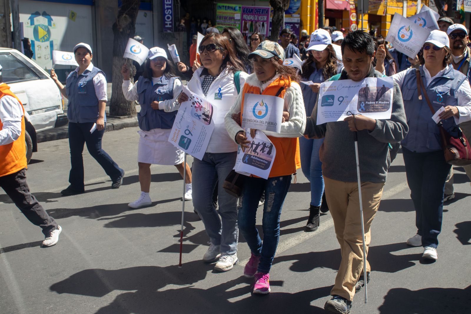 En ese contexto, este 8 de agosto en todo el país, la Defensoría del Pueblo desarrolló una caminata solidaria con las víctimas de violencia sexual, la misma se efectuó en las ciudades capitales e intermedias, donde, la Defensoría del Pueblo, a través de sus 21 oficinas convocó, a las organizaciones de la sociedad civil, fundaciones e instituciones publicas, sumarse a esta caminata, quienes se unieron en pro de la protección de la niñez y adolescencia.