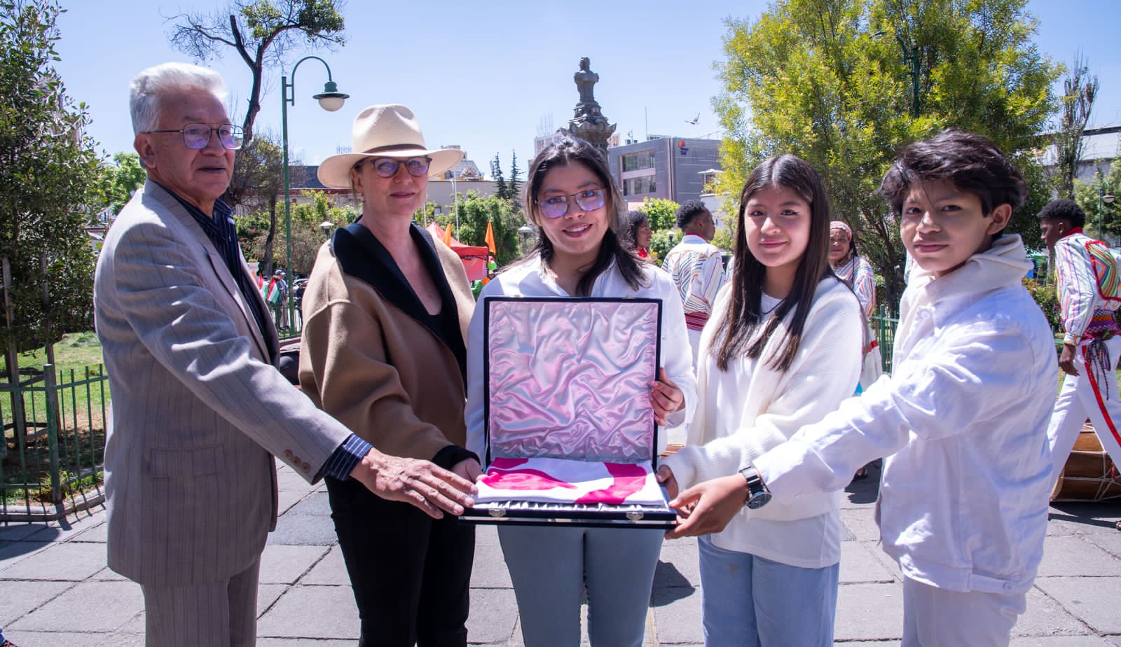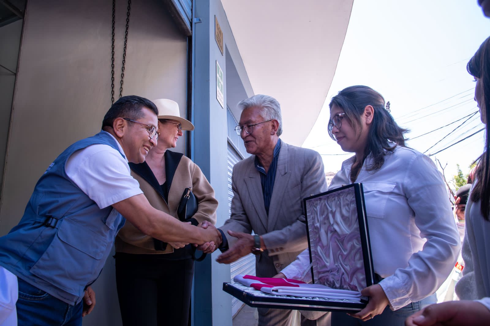 La bandera de la PAZ, fue entregada al Defensor del Pueblo por la Embajadora de los Derechos Humanos y Cultura de Paz, Katherine Ayala, junto a los defensores estudiantiles, José David Averanga y Briana Fernanda Balderrama, el representante de los promotores de derechos humanos de las personas adultas mayores, Rudy Gustavo Larrea Jaude, acompañados por la Coordinadora Residente de la ONU Bolivia.