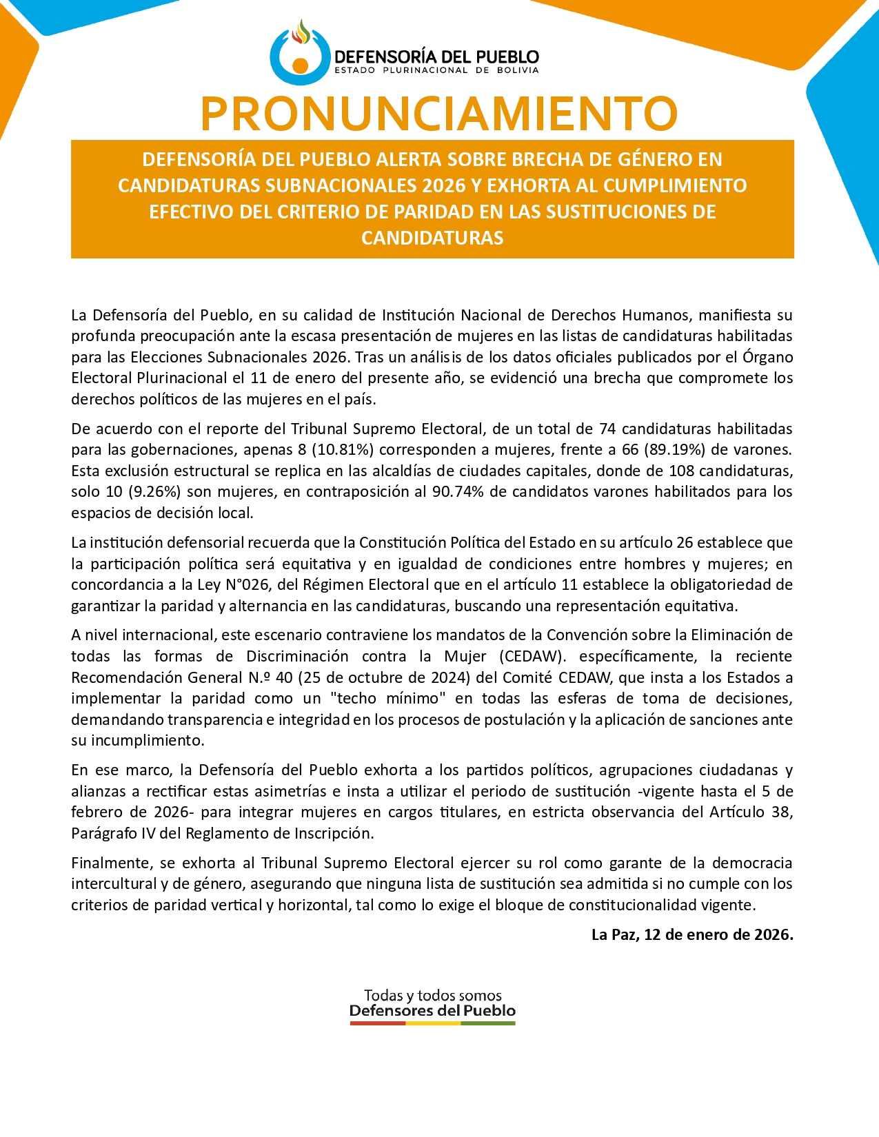 La Defensoría del Pueblo, en su calidad de Institución Nacional de Derechos Humanos, manifiesta su profunda preocupación ante la escasa presentación de mujeres en las listas de candidaturas habilitadas para las Elecciones Subnacionales 2026. Tras un análisis de los datos oficiales publicados por el Órgano Electoral Plurinacional el 11 de enero del presente año, se evidenció una brecha que compromete los derechos políticos de las mujeres en el país.