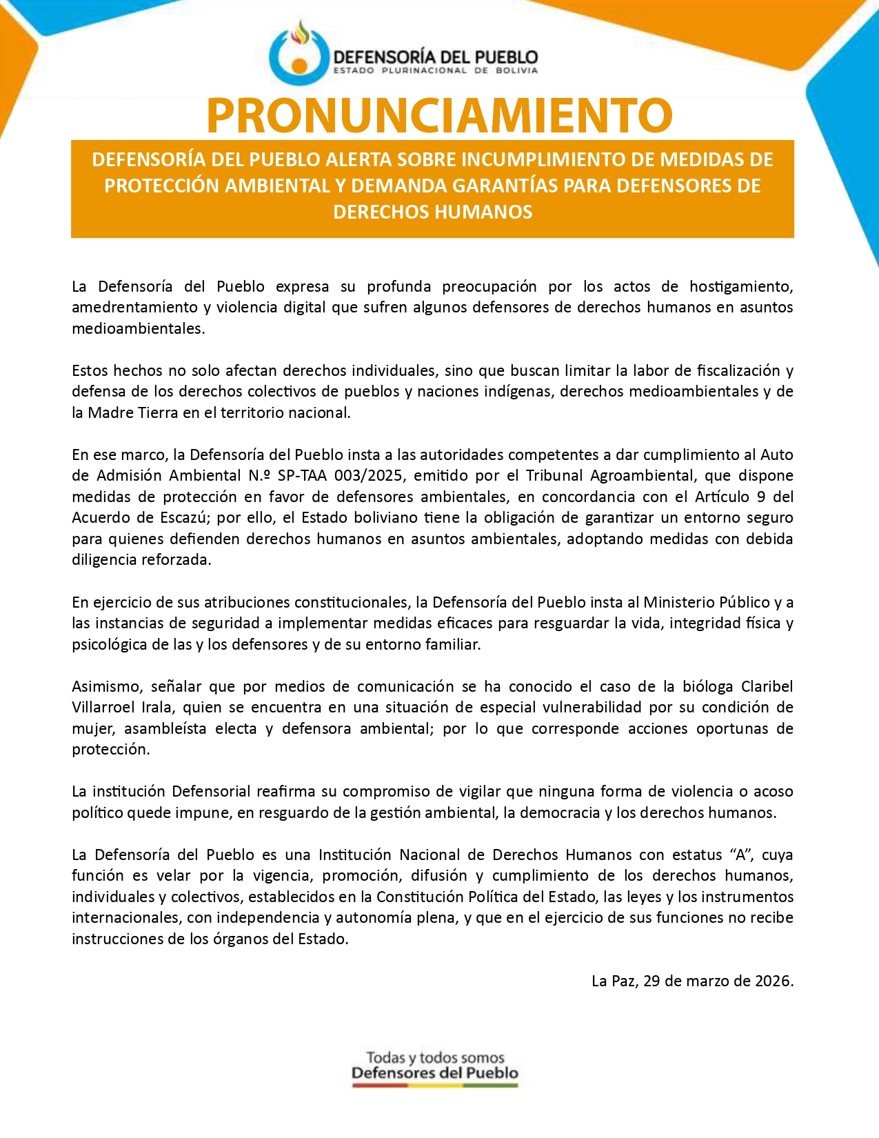 DEFENSORÍA DEL PUEBLO ALERTA SOBRE INCUMPLIMIENTO DE MEDIDAS DE PROTECCIÓN AMBIENTAL Y DEMANDA GARANTÍAS PARA DEFENSORES DE DERECHOS HUMANOS