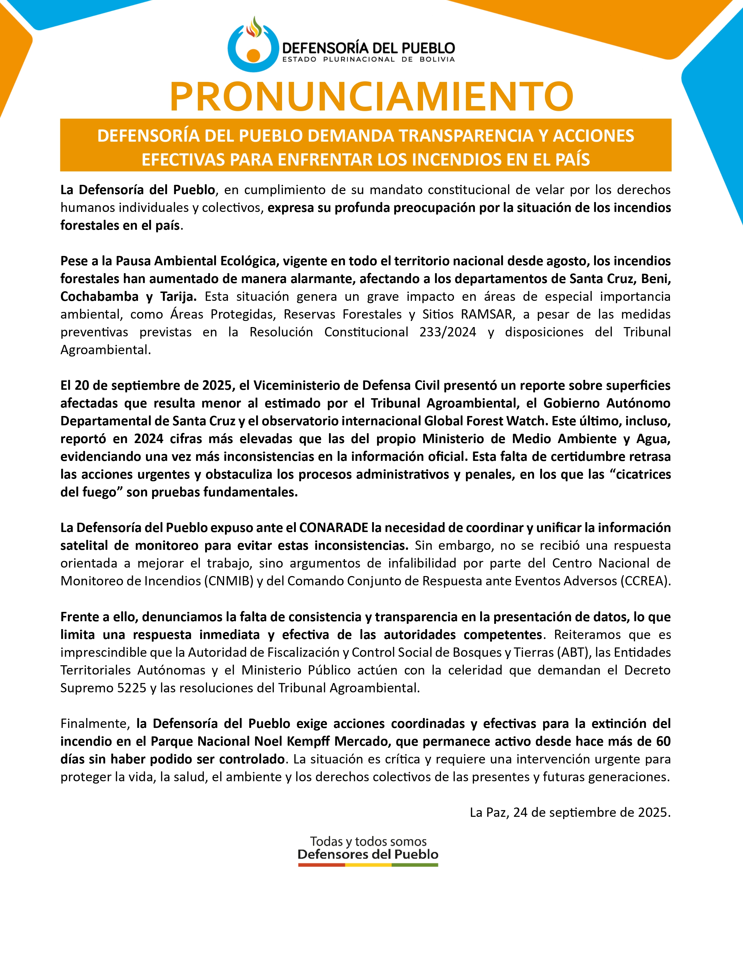 Finalmente, la Defensoría del Pueblo exige acciones coordinadas y efectivas para la extinción del incendio en el Parque Nacional Noel Kempff Mercado, que permanece activo desde hace más de 60 días sin haber podido ser controlado. La situación es crítica y requiere una intervención urgente para proteger la vida, la salud, el ambiente y los derechos colectivos de las presentes y futuras generaciones.