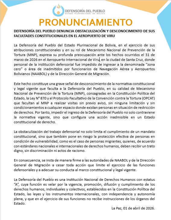 La Defensoría del Pueblo del Estado Plurinacional de Bolivia, en el ejercicio de sus atribuciones constitucionales y en su rol de Mecanismo Nacional de Prevención de la Tortura (MNP), expresa su profunda preocupación ante los hechos ocurridos el 31 de marzo de 2026 en el Aeropuerto Internacional de Viru Viru, en la ciudad de Santa Cruz, donde personal de la institución defensorial fue impedido de ingresar a la denominada “zona cero” o área de inadmitidos por funcionarios de Navegación Aérea y Aeropuertos Bolivianos (NAABOL) y de la Dirección General de Migración.