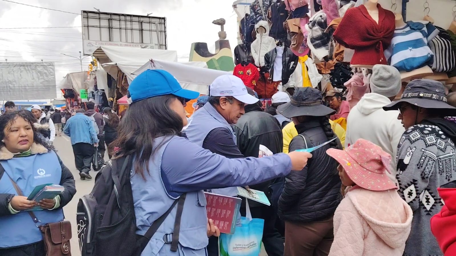 La actividad se desarrolló en la Feria 16 de Julio, donde el personal de la Unidad de Coordinación Regional de El Alto, con el apoyo de Voluntarios en Derechos Humanos y el acompañamiento musical del Conjunto Autóctono “Arawi Manta”, distribuyeron material informativo y brindaron orientación directa a la ciudadanía, para que conozcan sus derechos y las rutas de atención disponibles para acceder a mecanismos de protección de manera oportuna.