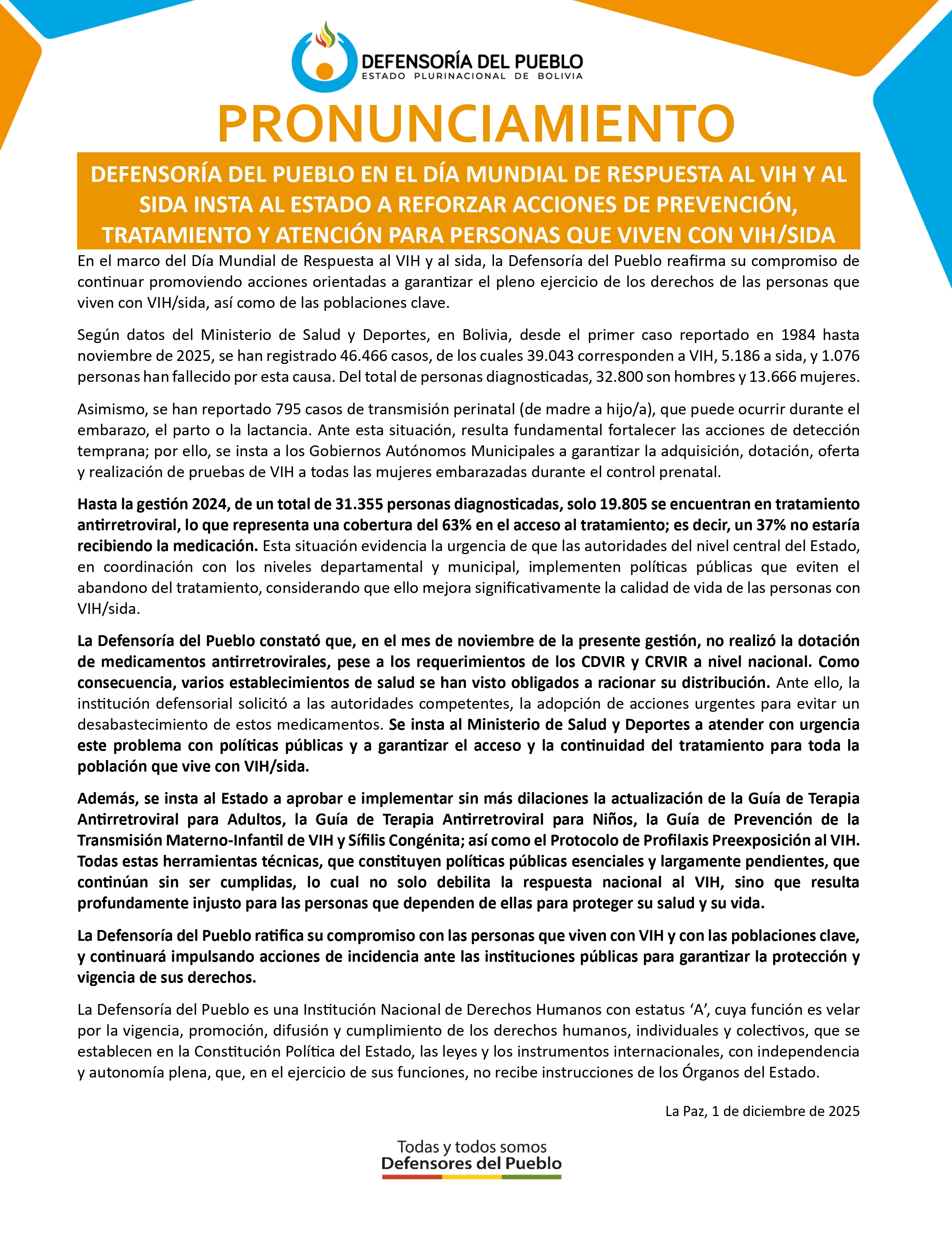 La Defensoría del Pueblo constató que, en el mes de noviembre de la presente gestión, no realizó la dotación de medicamentos antirretrovirales, pese a los requerimientos de los CDVIR y CRVIR a nivel nacional. Como consecuencia, varios establecimientos de salud se han visto obligados a racionar su distribución. Ante ello, la institución defensorial solicitó a las autoridades competentes, la adopción de acciones urgentes para evitar un desabastecimiento de estos medicamentos. Se insta al Ministerio de Salud y Deportes a atender con urgencia este problema con políticas públicas y a garantizar el acceso y la continuidad del tratamiento para toda la población que vive con VIH/sida.