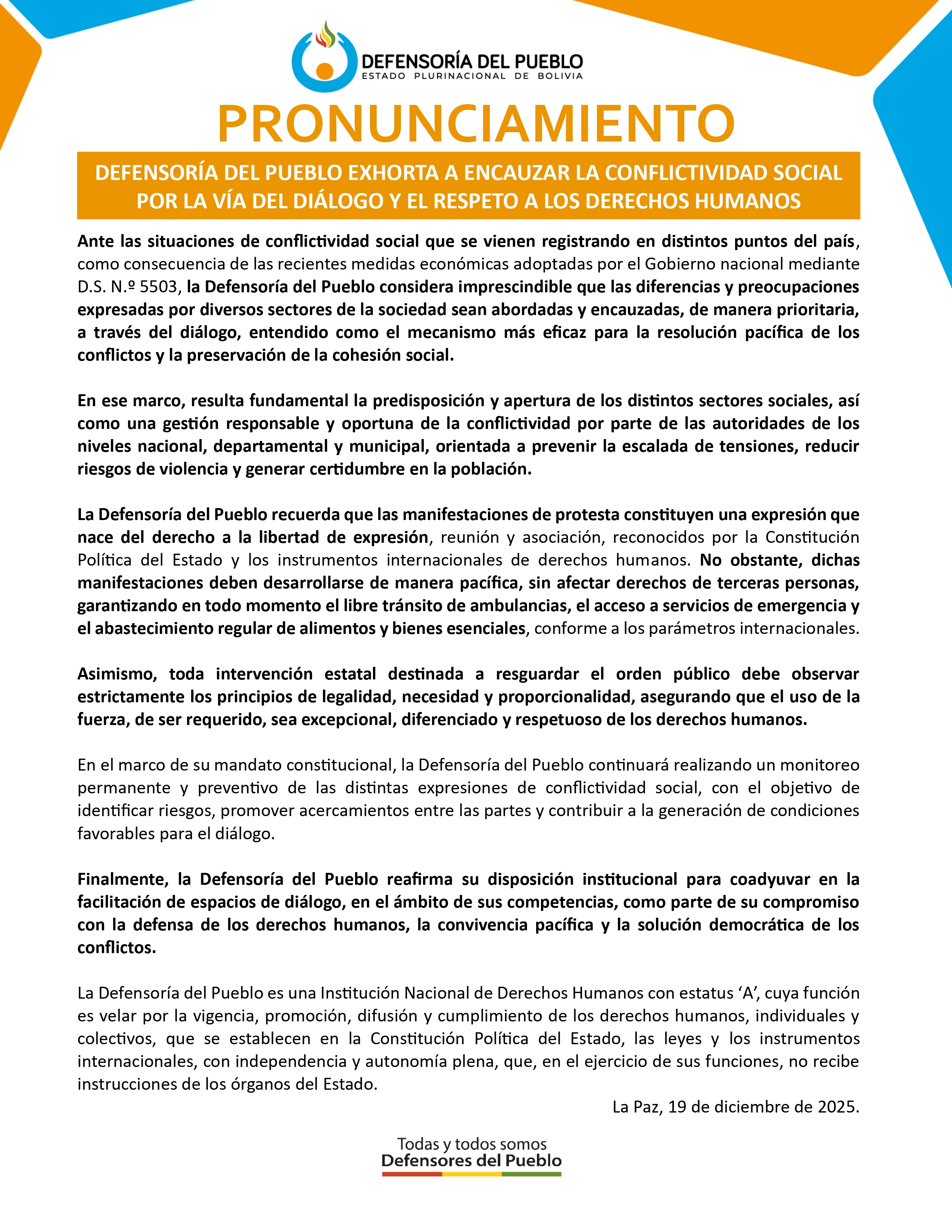 La Defensoría del Pueblo recuerda que las manifestaciones de protesta constituyen una expresión que nace del derecho a la libertad de expresión, reunión y asociación, reconocidos por la Constitución Política del Estado y los instrumentos internacionales de derechos humanos. No obstante, dichas manifestaciones deben desarrollarse de manera pacífica, sin afectar derechos de terceras personas, garantizando en todo momento el libre tránsito de ambulancias, el acceso a servicios de emergencia y el abastecimiento regular de alimentos y bienes esenciales, conforme a los parámetros internacionales.