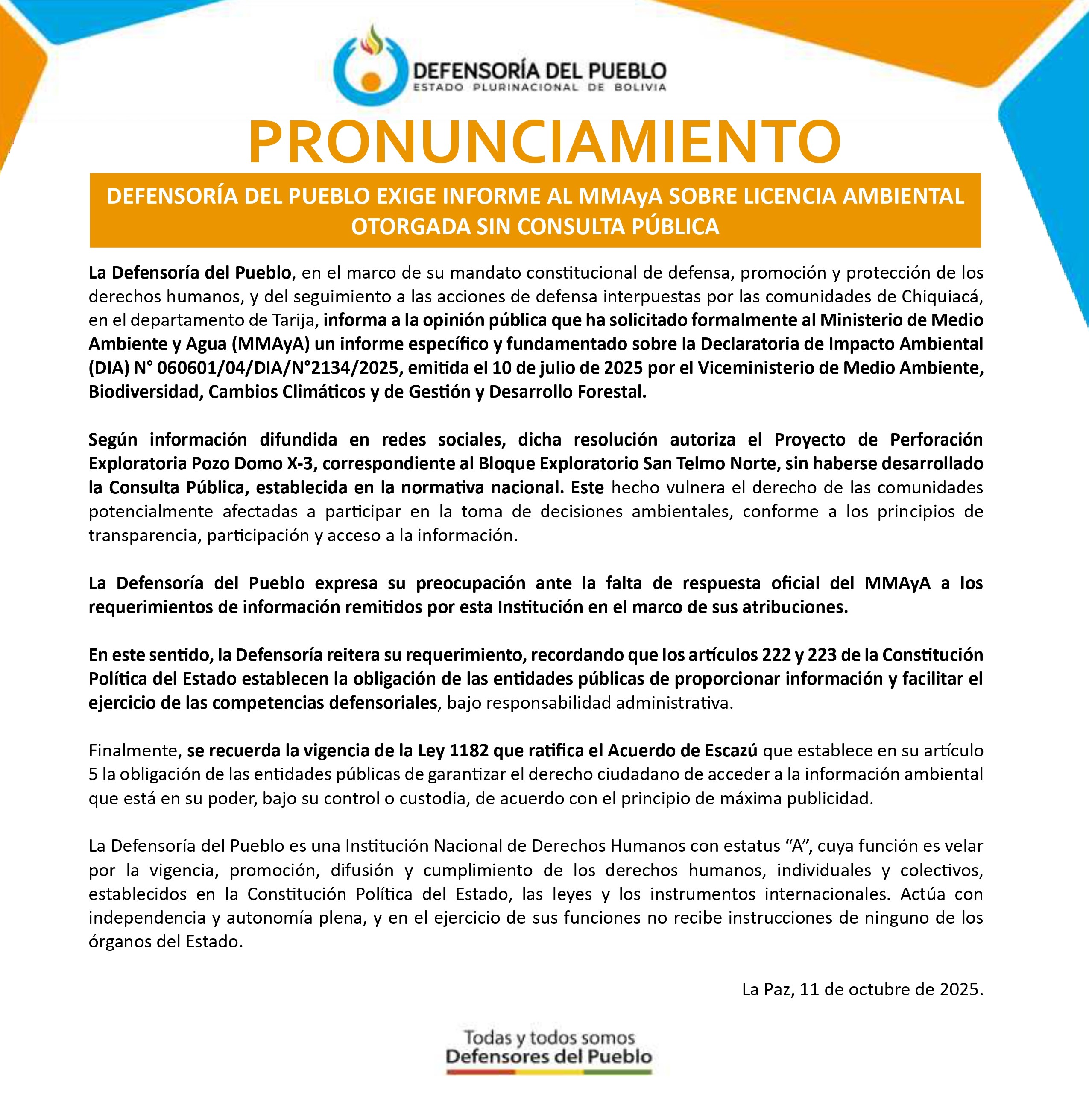 DEFENSORÍA DEL PUEBLO EXIGE INFORME AL MMAyA SOBRE LICENCIA AMBIENTAL OTORGADA SIN CONSULTA PÚBLICA