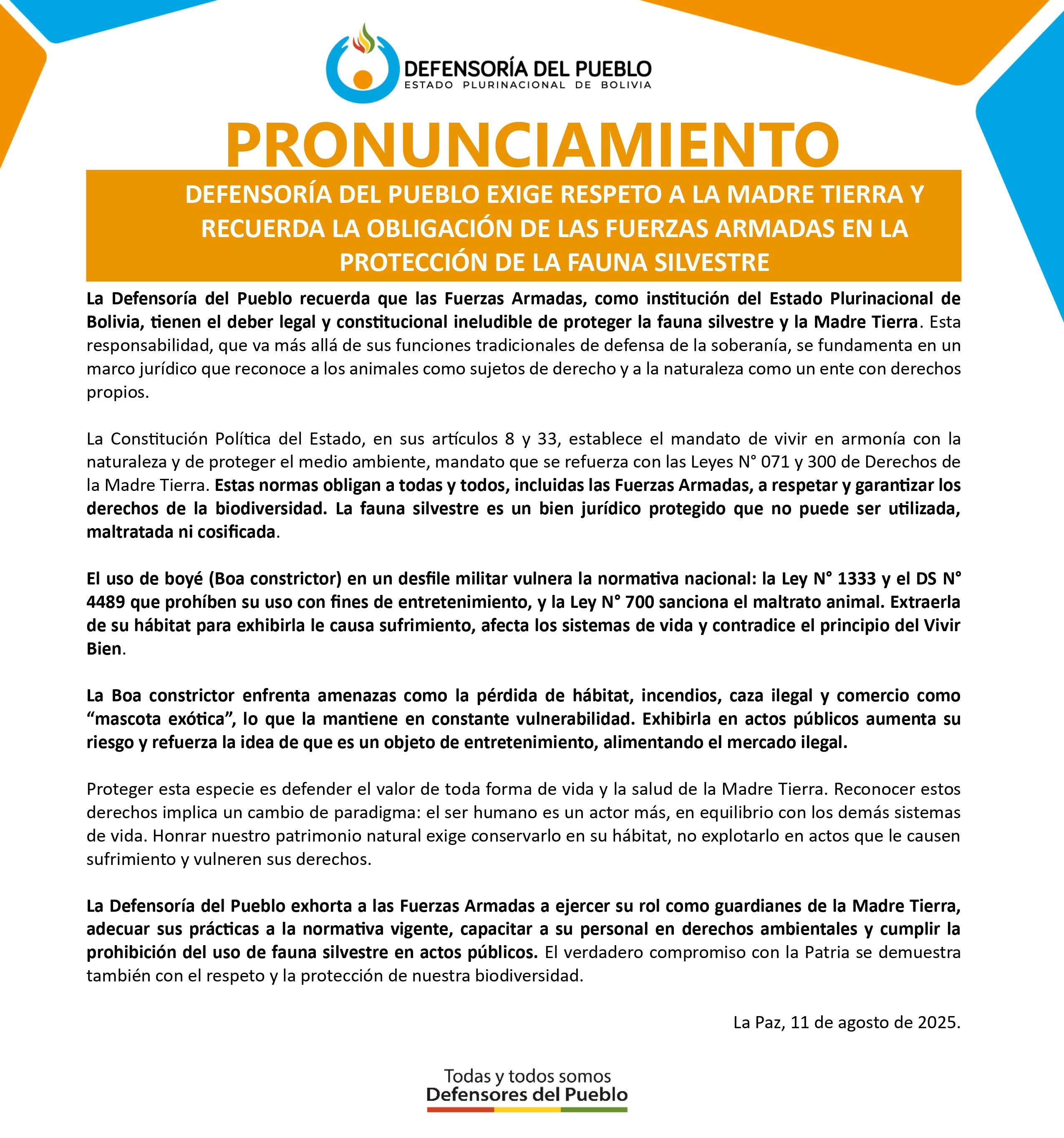 El uso de boyé (Boa constrictor) en un desfile militar vulnera la normativa nacional: la Ley N° 1333 y el DS N° 4489 que prohíben su uso con fines de entretenimiento, y la Ley N° 700 sanciona el maltrato animal. Extraerla de su hábitat para exhibirla le causa sufrimiento, afecta los sistemas de vida y contradice el principio del Vivir Bien.
