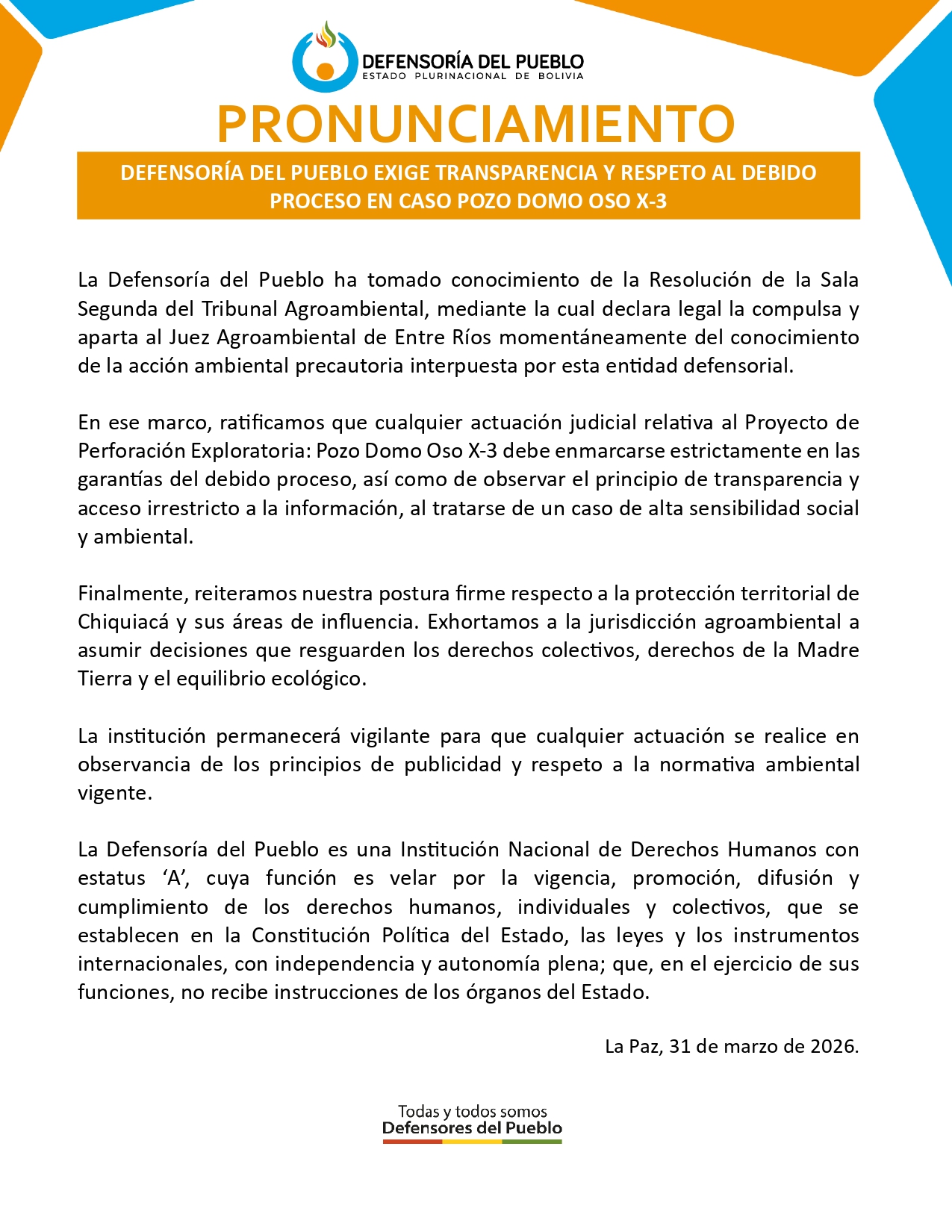 DEFENSORÍA DEL PUEBLO EXIGE TRANSPARENCIA Y RESPETO AL DEBIDO PROCESO EN CASO POZO DOMO OSO X-3