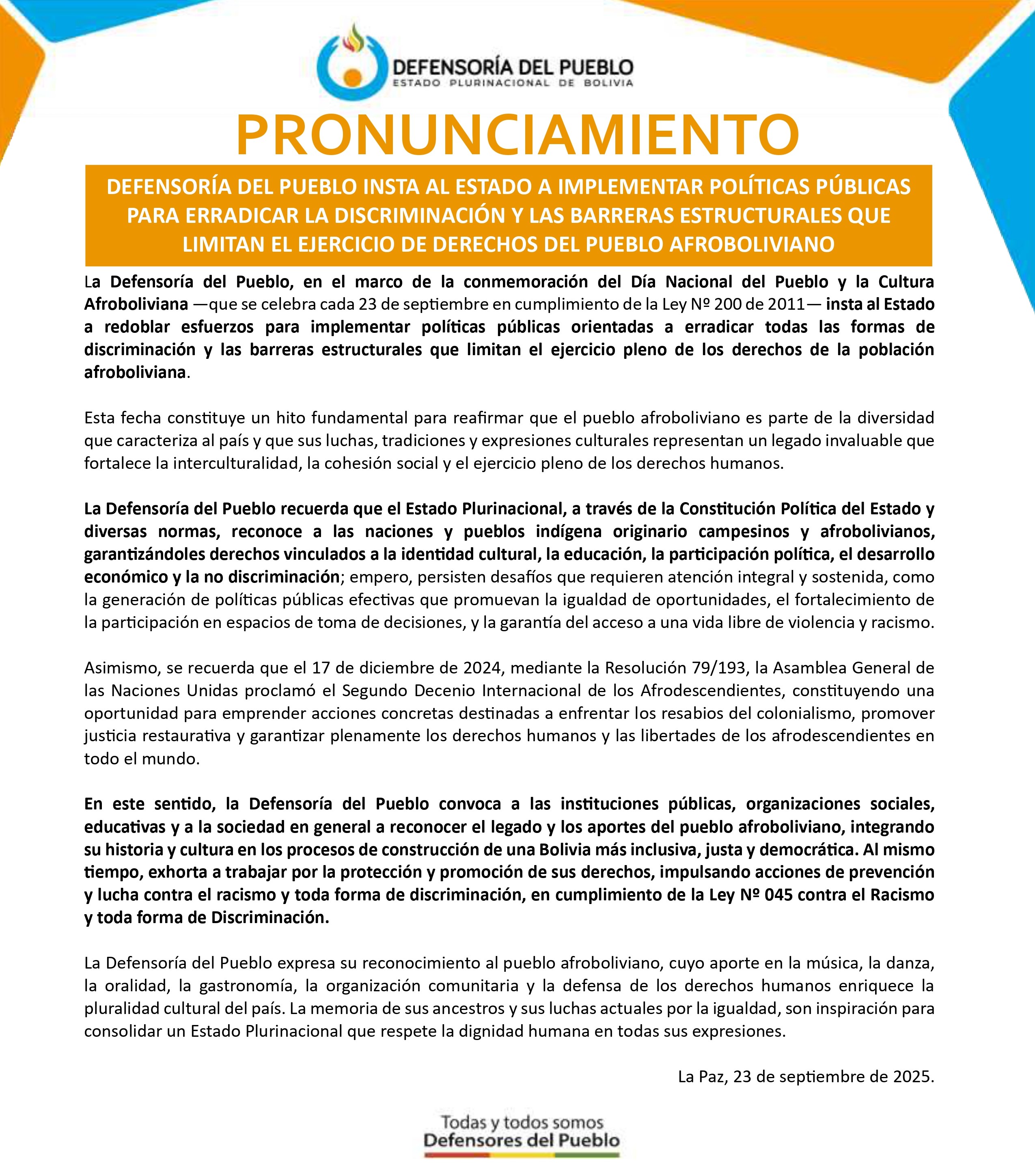 En este sentido, la Defensoría del Pueblo convoca a las instituciones públicas, organizaciones sociales, educativas y a la sociedad en general a reconocer el legado y los aportes del pueblo afroboliviano, integrando su historia y cultura en los procesos de construcción de una Bolivia más inclusiva, justa y democrática. Al mismo tiempo, exhorta a trabajar por la protección y promoción de sus derechos, impulsando acciones de prevención y lucha contra el racismo y toda forma de discriminación, en cumplimiento de la Ley Nº 045 contra el Racismo y toda forma de Discriminación.