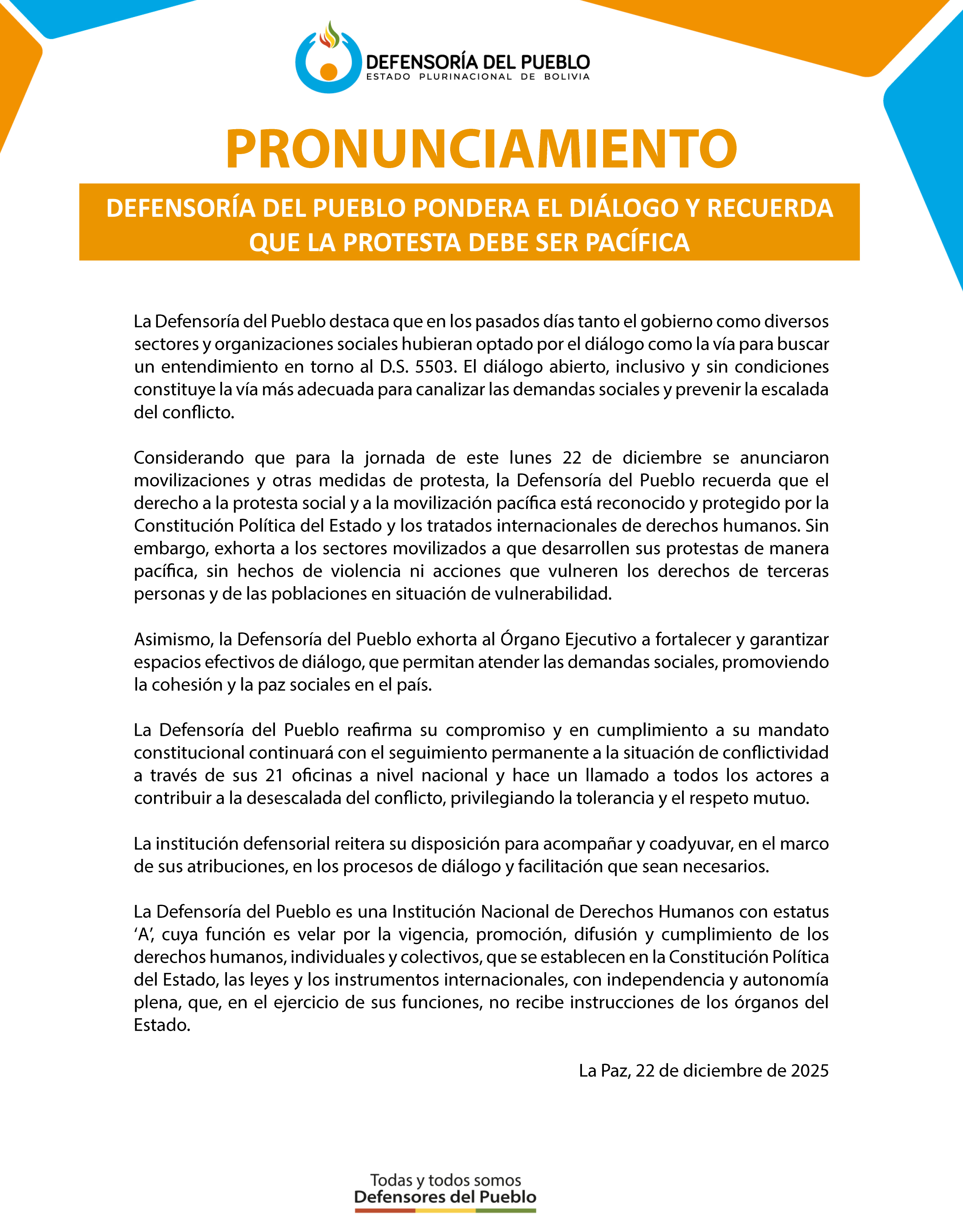 Considerando que para la jornada de este lunes 22 de diciembre se anunciaron movilizaciones y otras medidas de protesta, la Defensoría del Pueblo recuerda que el derecho a la protesta social y a la movilización pacífica está reconocido y protegido por la Constitución Política del Estado y los tratados internacionales de derechos humanos. Sin embargo, exhorta a los sectores movilizados a que desarrollen sus protestas de manera pacífica, sin hechos de violencia ni acciones que vulneren los derechos de terceras personas y de las poblaciones en situación de vulnerabilidad.