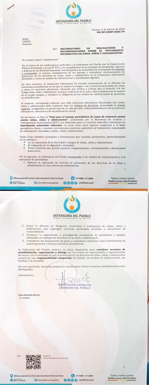"En cumplimiento de su mandato de promoción, vigencia y defensa de los derechos humanos, nos dirigimos a su autoridad con el propósito de recordar y recomendar el estricto cumplimiento de las normas y estándares internacionales de protección de los derechos de niñas, niños y adolescentes en el tratamiento informativo difundido a través de medios de comunicación y plataformas digitales", indica la nota firmada por el Defensor del Pueblo, Pedro Callisaya Aro.