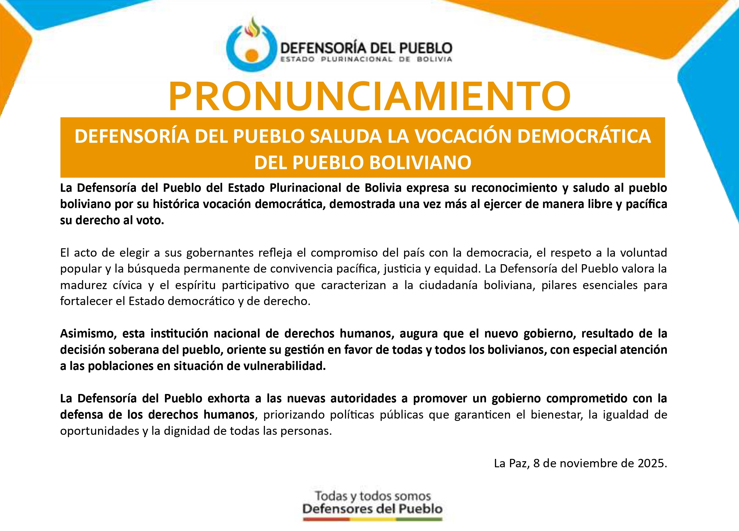 Asimismo, esta institución nacional de derechos humanos, augura que el nuevo gobierno, resultado de la decisión soberana del pueblo, oriente su gestión en favor de todas y todos los bolivianos, con especial atención a las poblaciones en situación de vulnerabilidad.