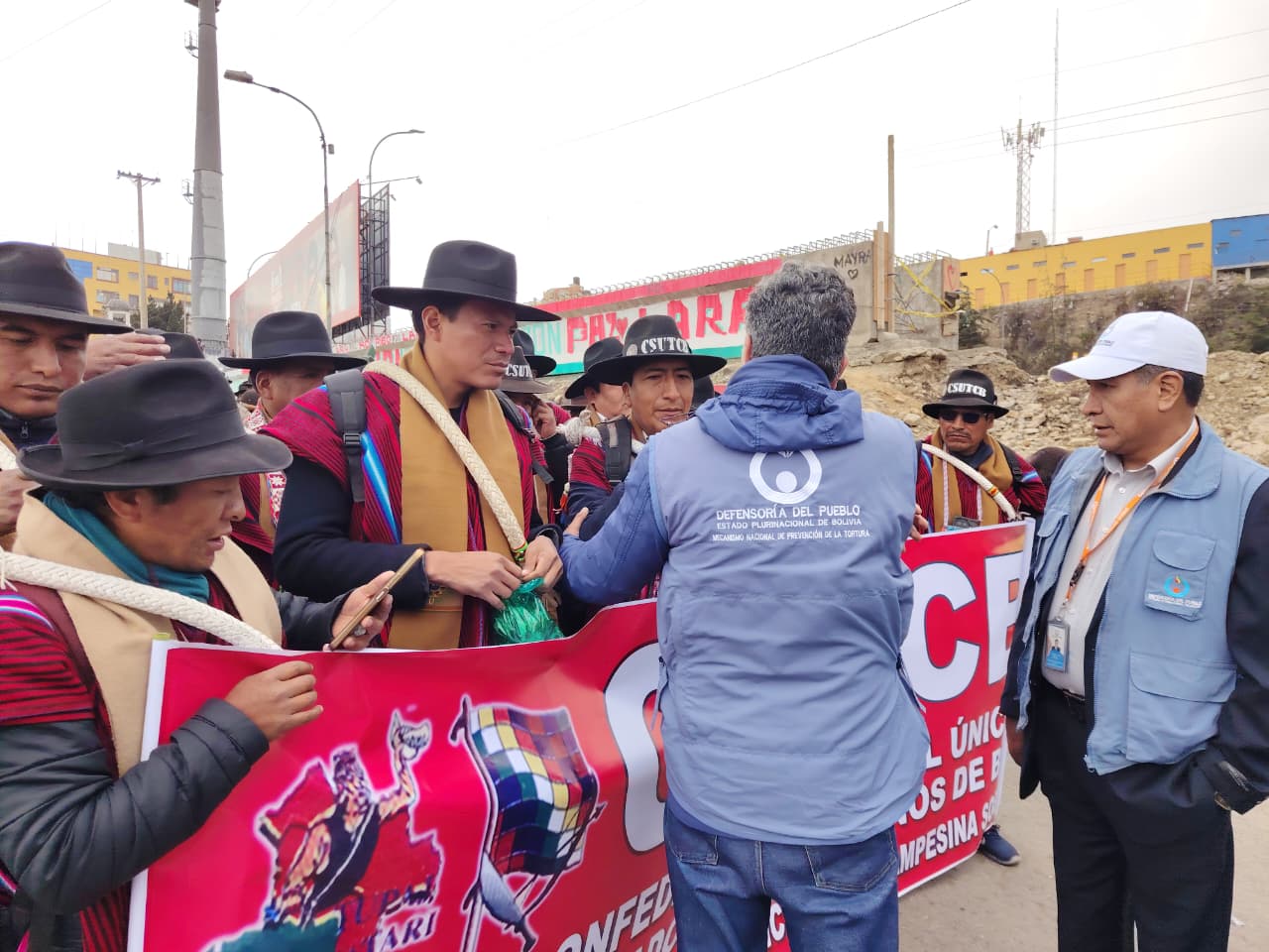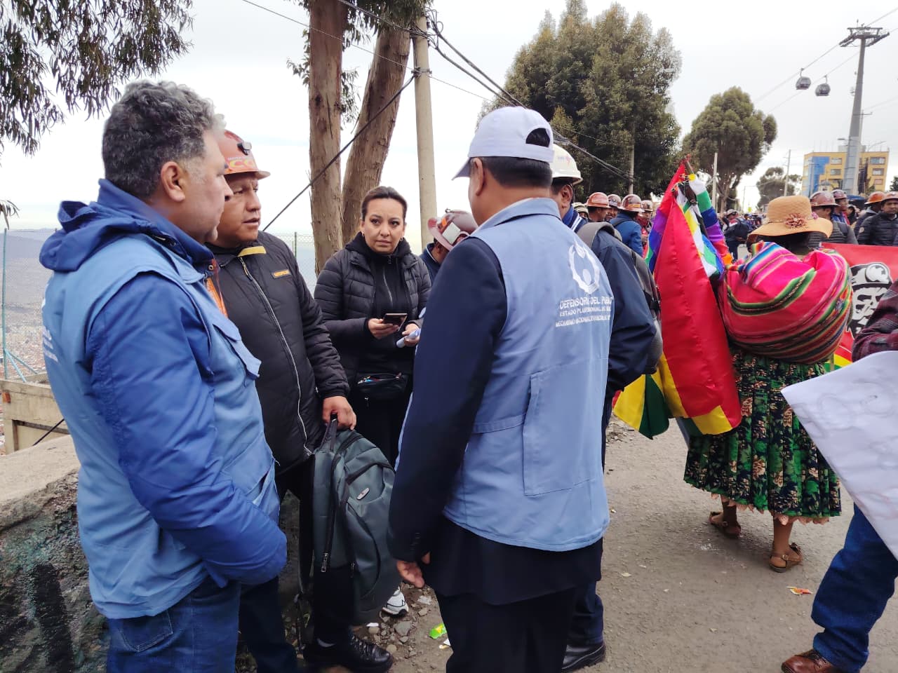 En La Paz, la Defensoría del Pueblo acompañó las movilizaciones de la Central Obrera Boliviana, sectores fabriles y mineros, y sostuvo reuniones con autoridades policiales. A primera hora de la jornada, el Defensor del Pueblo, Pedro Callisaya, recordó que la institución defensorial “monitorea permanentemente las movilizaciones y recomienda evitar cualquier hecho de violencia o exceso en el uso de la fuerza pública”, reafirmando la obligación del Estado de garantizar el derecho a la protesta pacífica y la integridad de las personas.