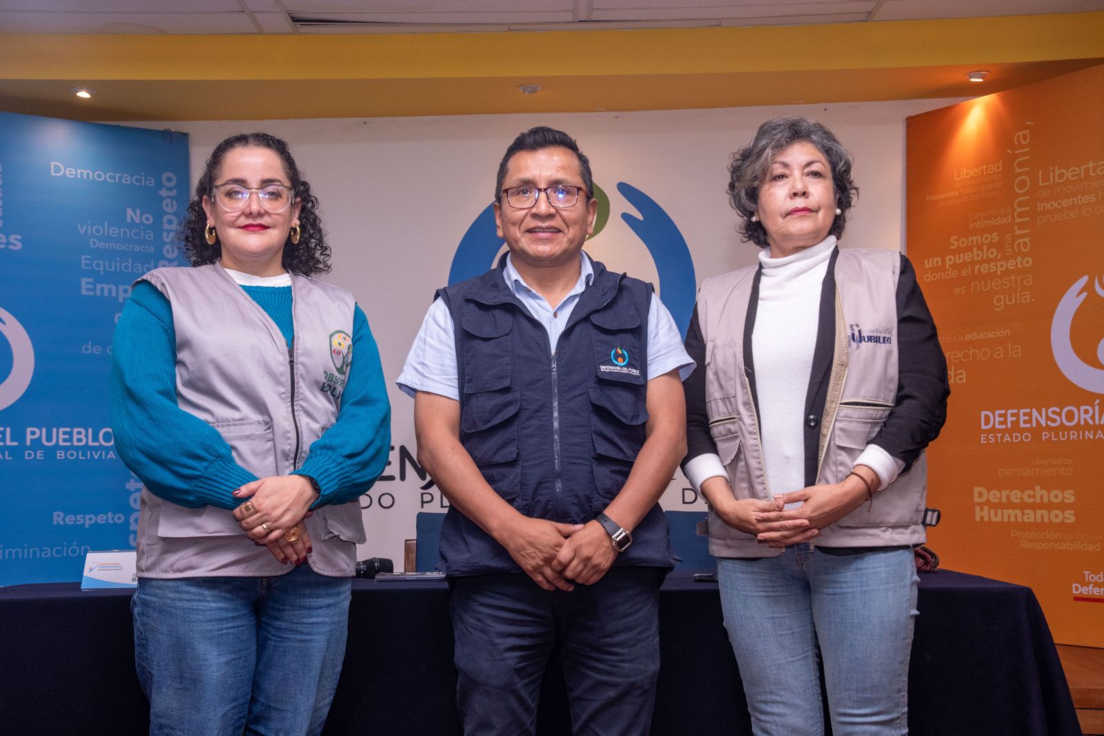 La Paz, 18 de marzo de 2026 (UCOM-DPB).– El Defensor del Pueblo, Pedro Callisaya, junto con representantes de la Misión de Observación Electoral JUBILEO (MOE JUBILEO), Sandra Verduguez; la Misión de Observación Electoral Ciudadana de la Red Observa Bolivia (MOEC-OB), Susana Saavedra; así como de la Fundación UNIR y el Centro de Investigación y Promoción del Campesinado (CIPCA), presentaron una declaración conjunta de la Mesa de Análisis de la Conflictividad Electoral.
