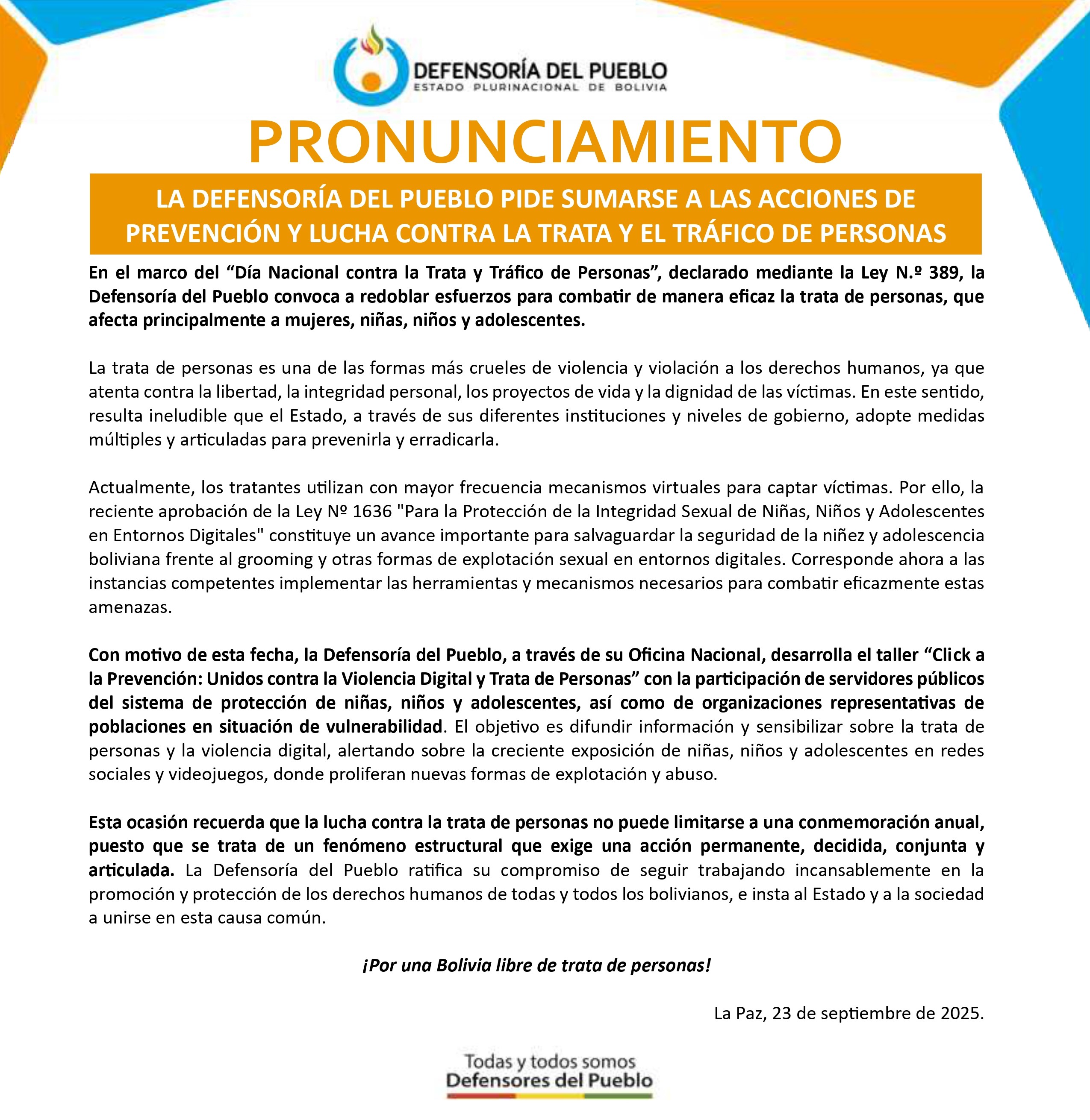 LA DEFENSORÍA DEL PUEBLO PIDE SUMARSE A LAS ACCIONES DE PREVENCIÓN Y LUCHA CONTRA LA TRATA Y EL TRÁFICO DE PERSONAS
