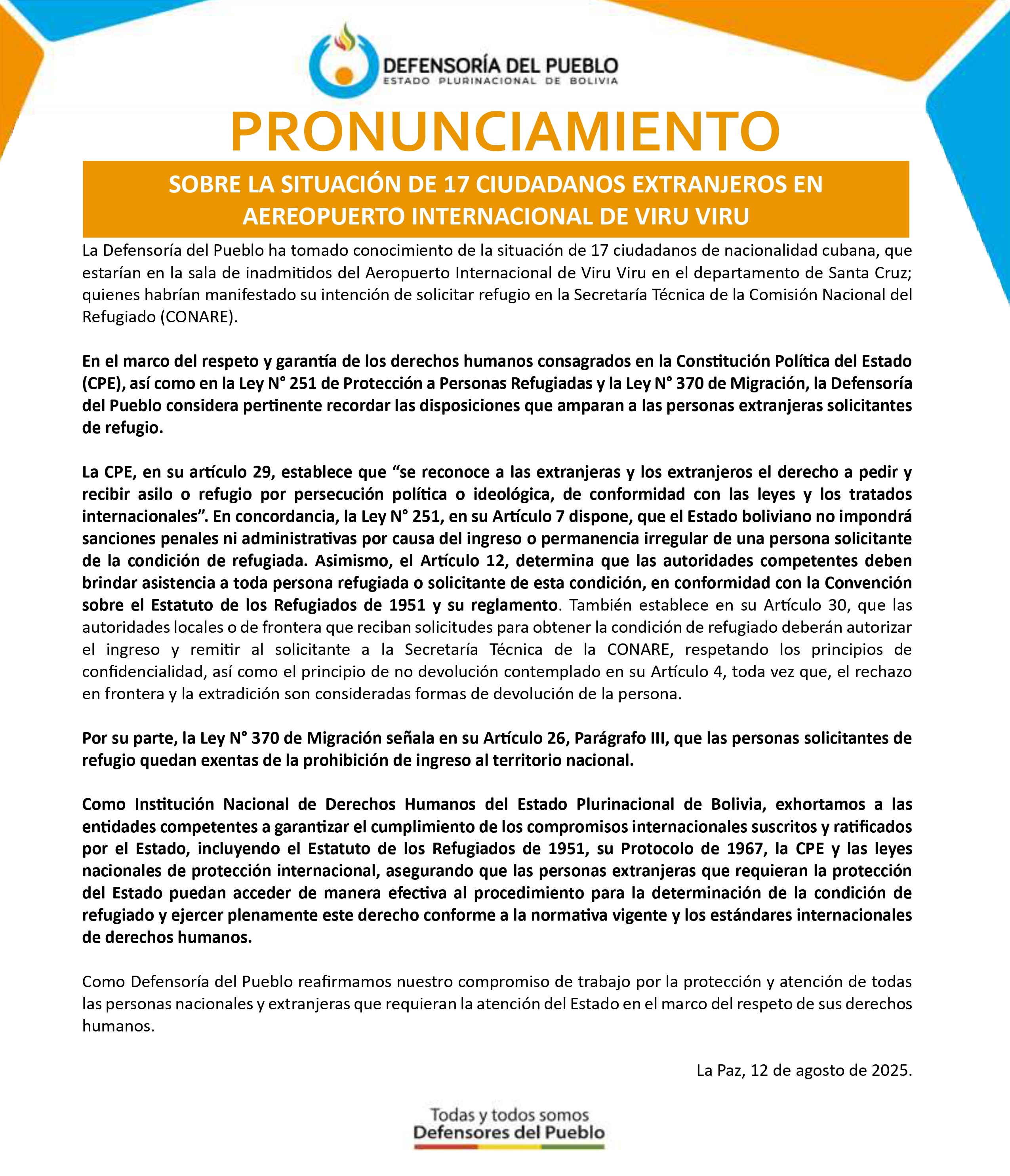 Como Institución Nacional de Derechos Humanos del Estado Plurinacional de Bolivia, exhortamos a las entidades competentes a garantizar el cumplimiento de los compromisos internacionales suscritos y ratificados por el Estado, incluyendo el Estatuto de los Refugiados de 1951, su Protocolo de 1967, la CPE y las leyes nacionales de protección internacional, asegurando que las personas extranjeras que requieran la protección del Estado puedan acceder de manera efectiva al procedimiento para la determinación de la condición de refugiado y ejercer plenamente este derecho conforme a la normativa vigente y los estándares internacionales de derechos humanos.