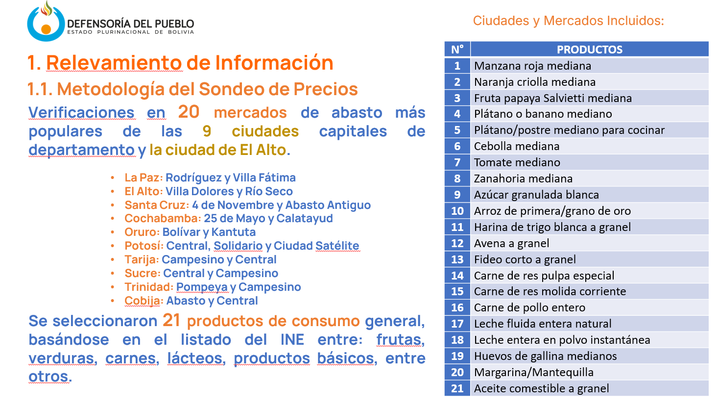 El relevamiento abarcó 21 productos en 20 mercados y centros de abasto de nueve ciudades capitales y El Alto. “Se seleccionaron 21 productos de consumo general, basándose en el listado del INE entre: frutas, verduras, carnes, lácteos y productos básicos, entre otros”, explicó el Defensor del Pueblo.