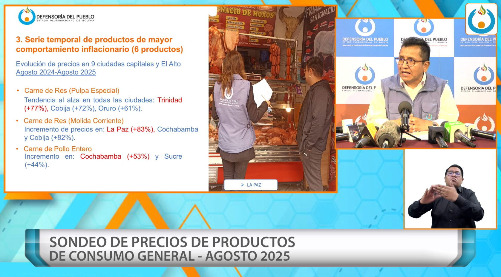 La Paz, septiembre 8 (UCOM/DPB).– Velando por el derecho de la población a la alimentación, el Defensor del Pueblo, Pedro Callisaya, presentó el reporte del Sondeo de Precios de Consumo General, que arrojó dos resultados importantes: primero, una tendencia inflacionaria en seis productos al comparar los precios de julio y agosto de 2025; y segundo, un “comportamiento inflacionario” en 13 productos esenciales al comparar los precios entre agosto de 2024 y agosto de 2025.