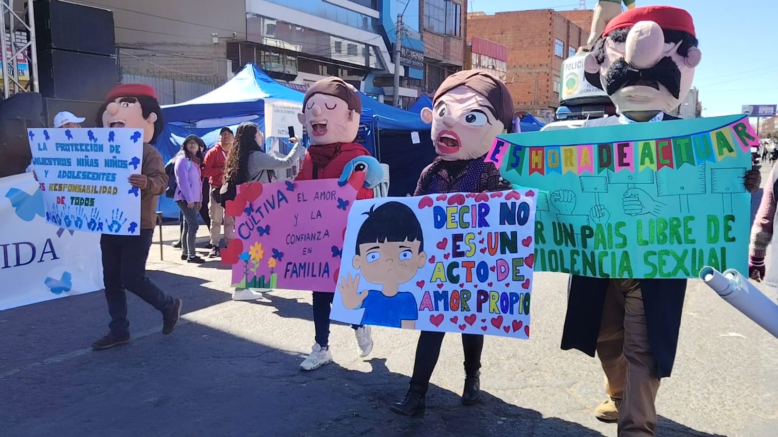 Además, de las unidades educativas Villa Tunari y Eben Ezer; las Universidades San Francisco de Asís y Franz Tamayo, sociedad civil, Defensoras y Defensores Voluntarios en Derechos Humanos de la Defensoría del Pueblo, Promotoras Comunitarias Sayari, entre otros. La misma concluyó con una feria interinstitucional que se realizó en la Av. Juan Pablo II, altura del edificio emblemático de la Universidad Pública de El Alto, donde se distribuyó materiales de difusión y promoción e informativas sobre la prevención de la violencia en contra de NNAs.