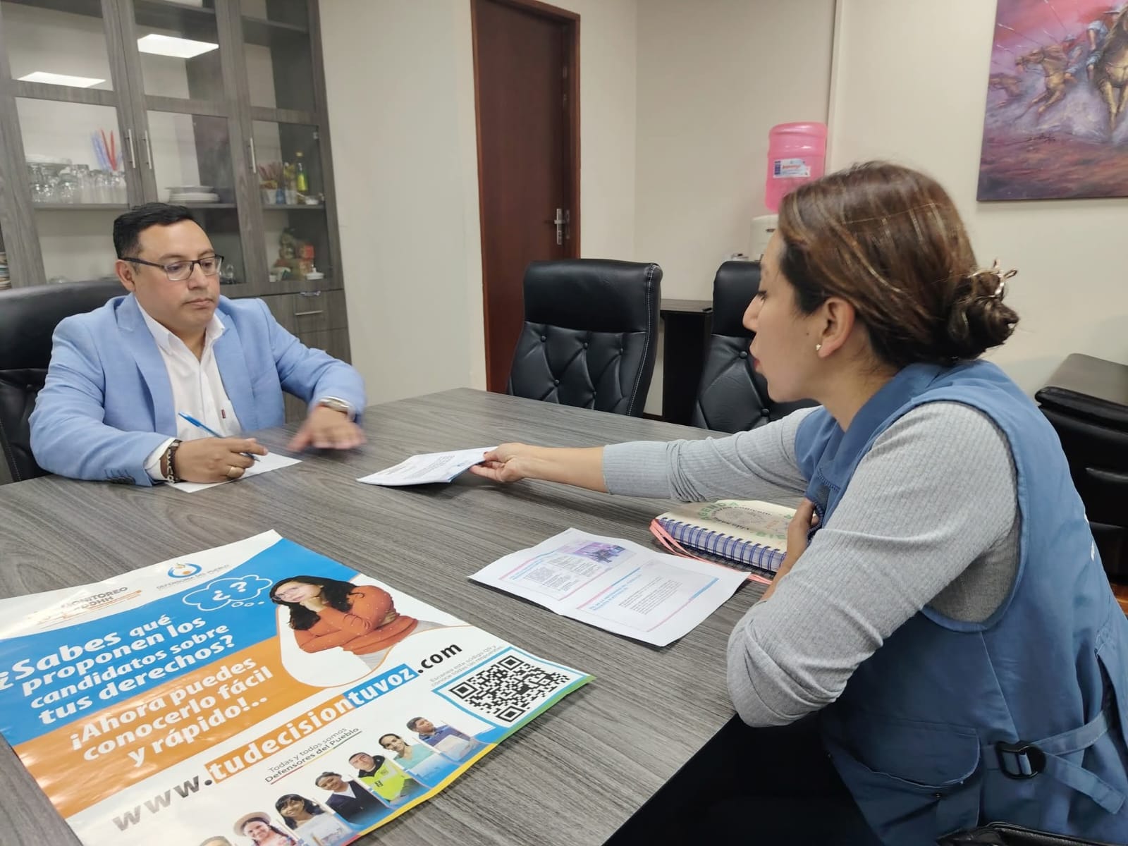 De forma paralela, se llevó a cabo una reunión con el Presidente del Tribunal Departamental de Justicia de Tarija (TDJ), Luis Ortiz, a quien se presentó detalladamente el Plan de monitoreo y dio a conocer el portal web www.tudecisiontuvoz.com. Al concluir, la autoridad se comprometió a emitir un instructivo dirigido a todos los juzgados del departamento, con el objetivo de garantizar el conocimiento y apoyo a la labor defensorial durante todo el proceso electoral.