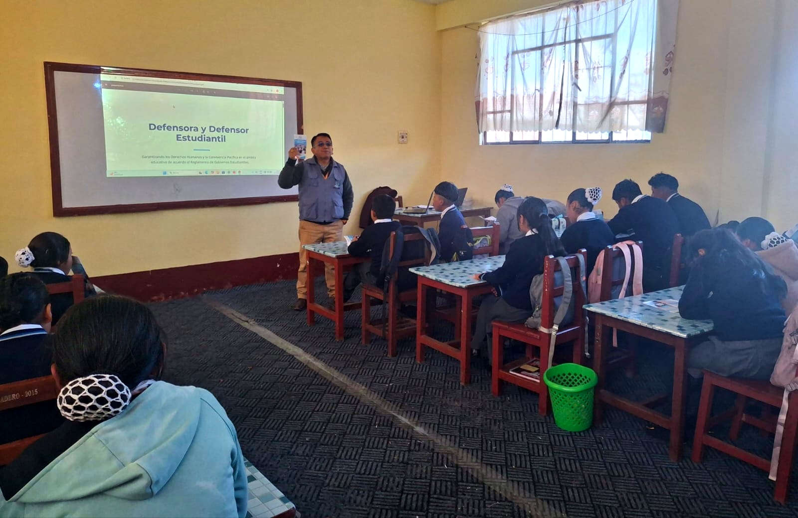 Desaguadero, 31 de marzo de 2026 (UCOM/UCRD). – La Defensoría del Pueblo, desarrolló una jornada de socialización con estudiantes del nivel secundario de la Unidad Educativa “José Ballivián”, con el objetivo de promover su participación democrática para la elección de la Defensora y Defensor Estudiantil.