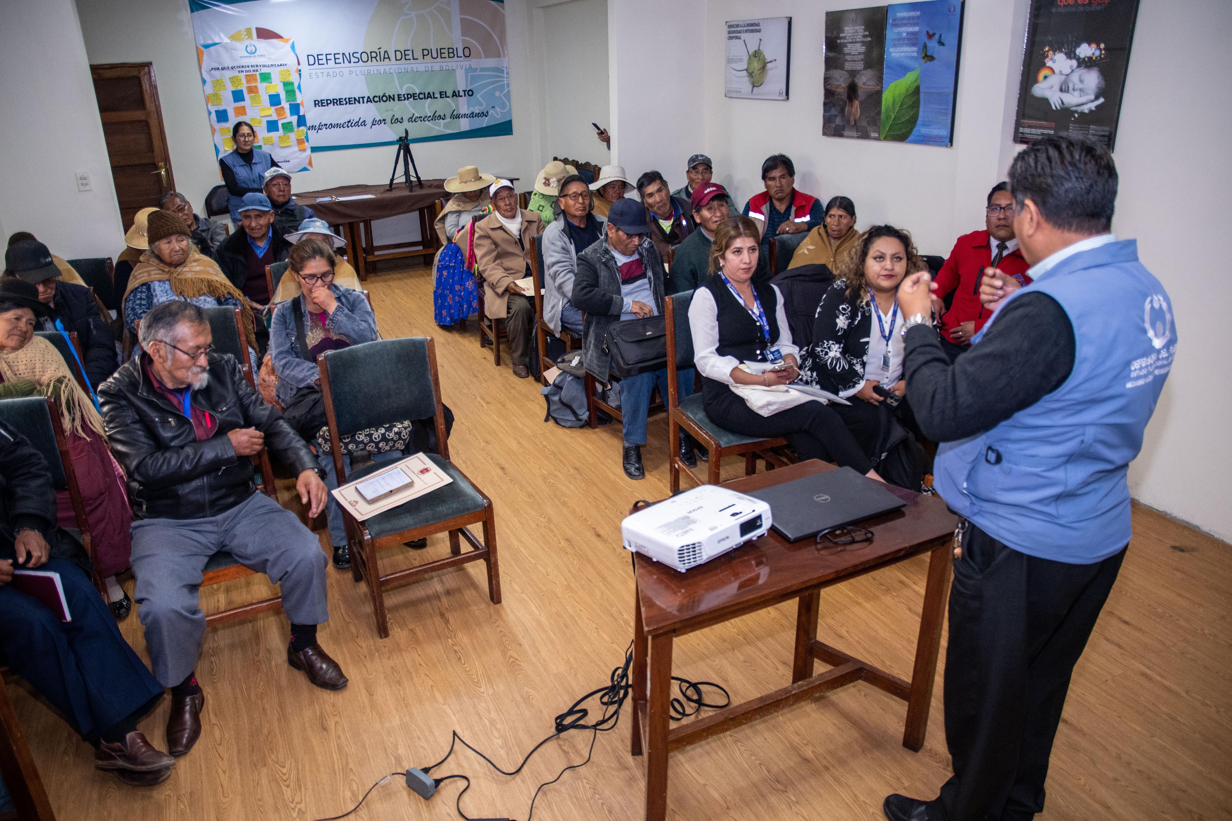 “Por instrucción del Defensor del Pueblo, Pedro Callisaya Aro, en el Dia del Adulto Mayor, realizamos un taller informativo, para que las instituciones SEPDAVI, SIJPLU y la Unidad del Adulto Mayor, brinden información sobre sus atribuciones y el servicio que brindan a las personas adultas mayores”, informó el responsable de la Unidad de Coordinación Regional de El Alto, Fernando Claros.