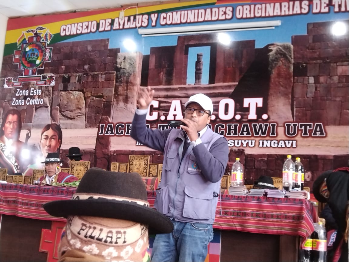 "Por instrucción del Defensor del Pueblo, Pedro Callisaya Aro, realizamos un taller masivo sobre la Ley N° 073 de Deslinde Jurisdiccional (...) está actividad contó con la participación de más de 400 personas, entre ellos miembros del consejo de Ayllus y comunidades originarias para fortalecer la capacidad en la aplicación de la justicia comunitaria de acuerdo con la normativa vigente y sin vulnerar derechos humanos", informó Teodoro Canaviri, responsable de la Unidad de Coordinación Regional de Desaguadero.
