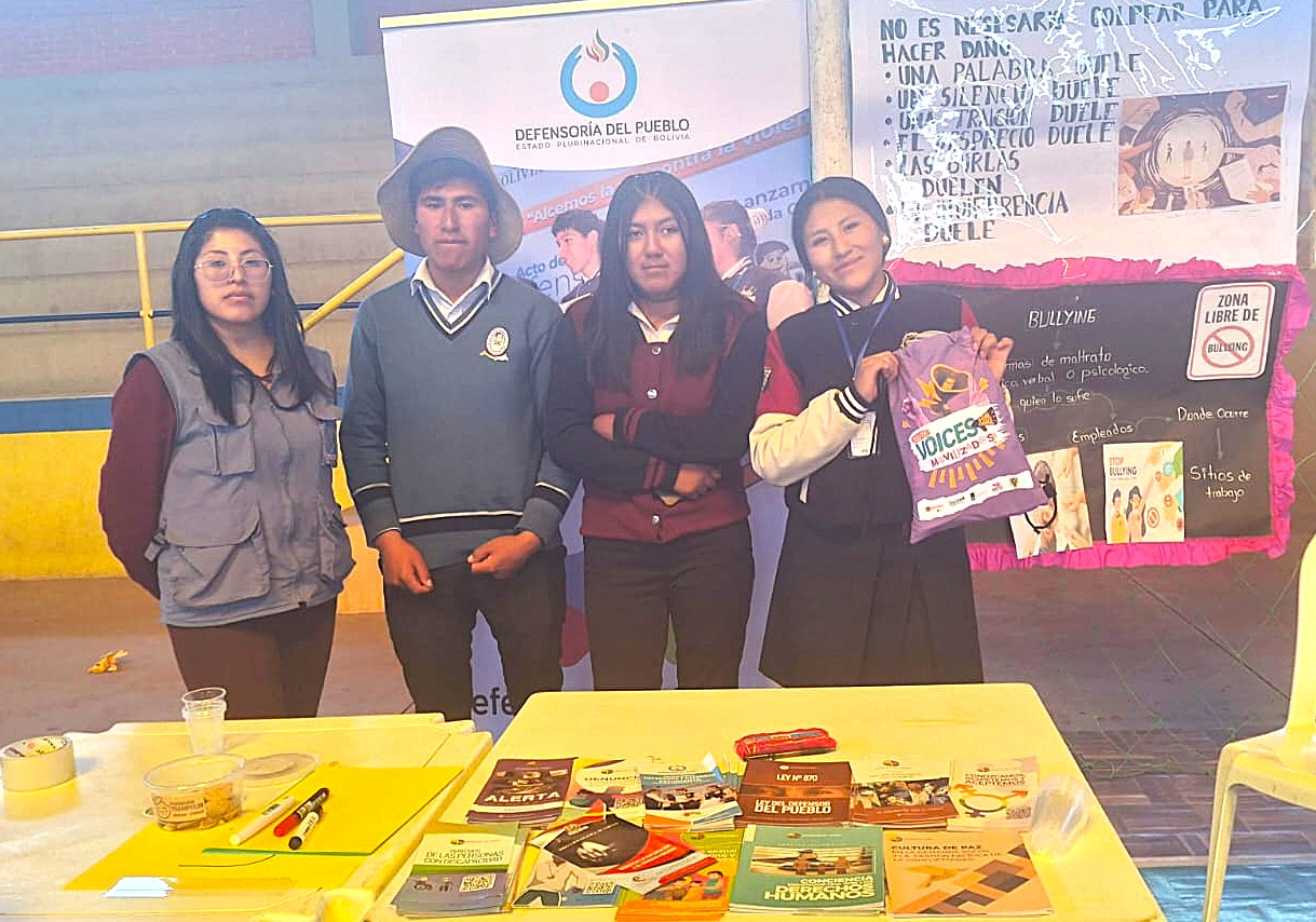 Las y los defensores estudiantiles, lideraron espacios de diálogo sobre su rol como promotores del respeto de los derechos humanos de niñas, niños y adolescentes (NNAs) estudiantes al interior de su unidad educativa, con la población que participó de la feria binacional, entre otros temas, también socializaron la importancia de la lucha contra la violencia y la trata de personas, para garantizar una niñez libre y segura.