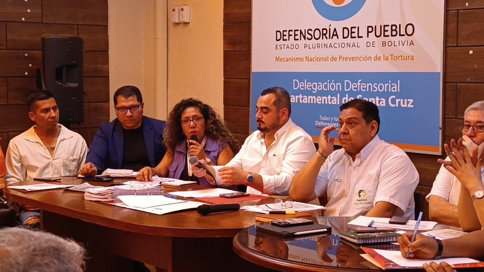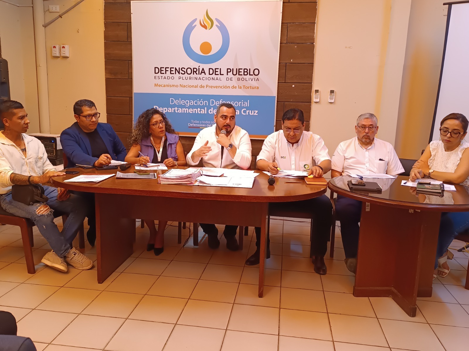 La reunión, en el salón de la Delegación Defensorial de Santa Cruz, contó con la participación del Secretario Departamental de Salud y Desarrollo Humano, Edil Toledo; el Director del SEDES, Julio César Koca; la Directora de Gestión Hospitalaria de la Gobernación, Daniela Lino; el Secretario Municipal de Salud, Michael Méndez Pinto; el Jefe Departamental del Trabajo, Tito Coaquira; el representante legal del Sindicato de Trabajadores de Salud, Rajiv Echalar; y delegados de los sindicatos de salud de los tres niveles de atención.